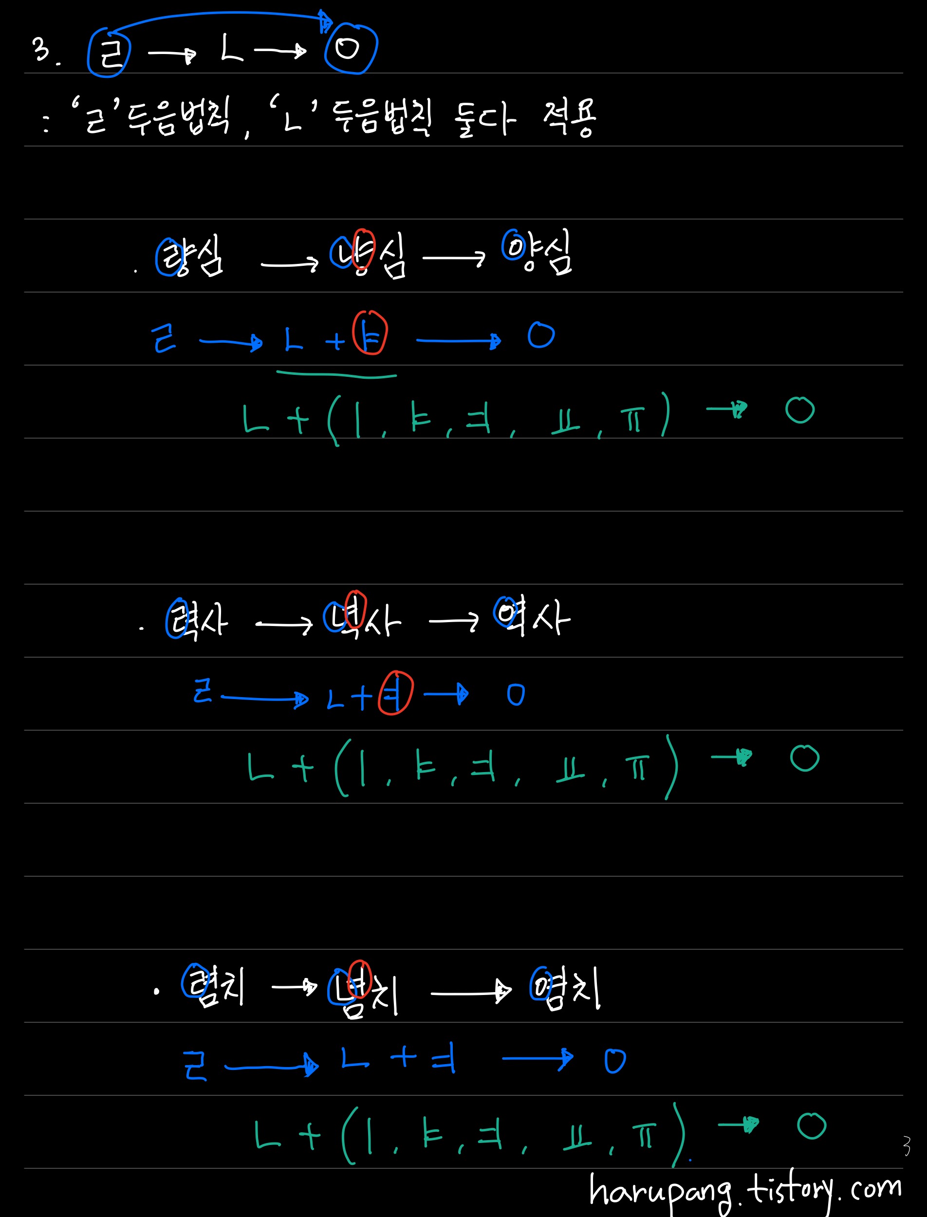 3. 'ㄹ,ㄴ' 두음법칙 혼합 : ㄹ-->ㄴ-->-->ㅇ