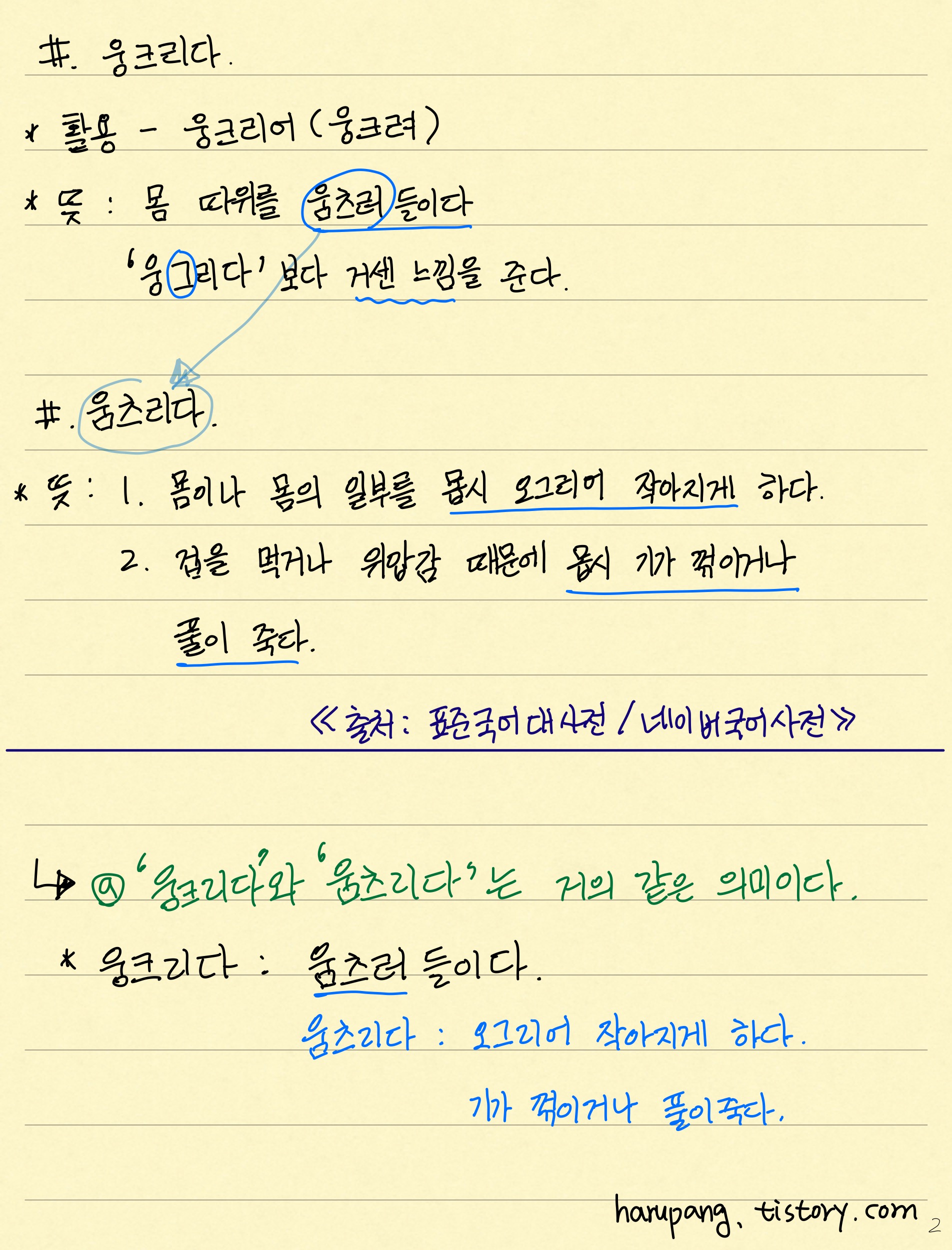 --> @'웅크리다'와 '움츠리다'는 거의 같은 의미이다.