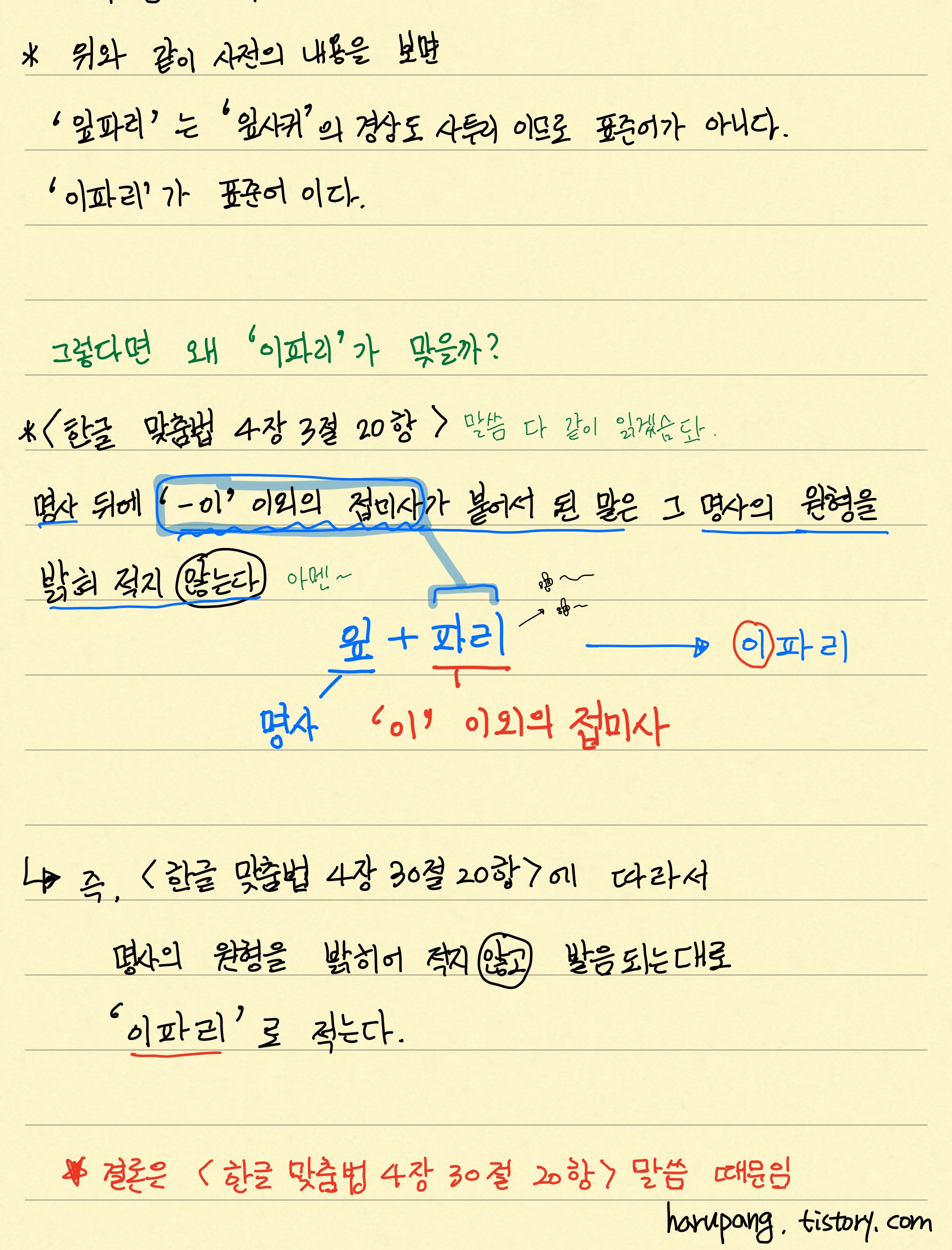 -->즉 , <한글 맞춤법 4장 30절 20항>에 따라서 명사의 원형을 밝히어 적지 않고 , 발음되는대로 '이파리'로 적는다.