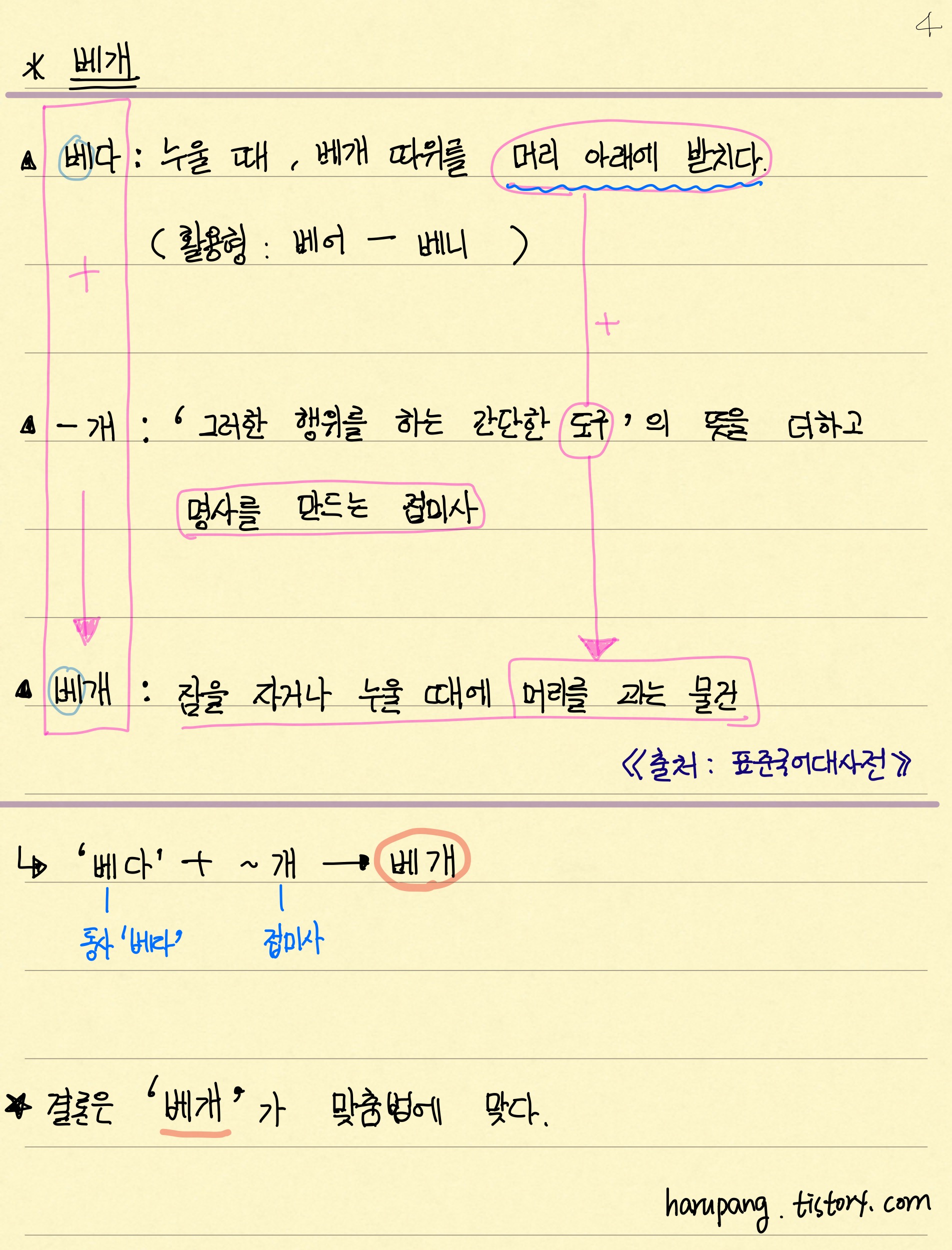 동사<베다>와 접미사<~개>가 결합한 것이기 때문에 <베개>가 맞다. → 배개(X) / 베개(O)