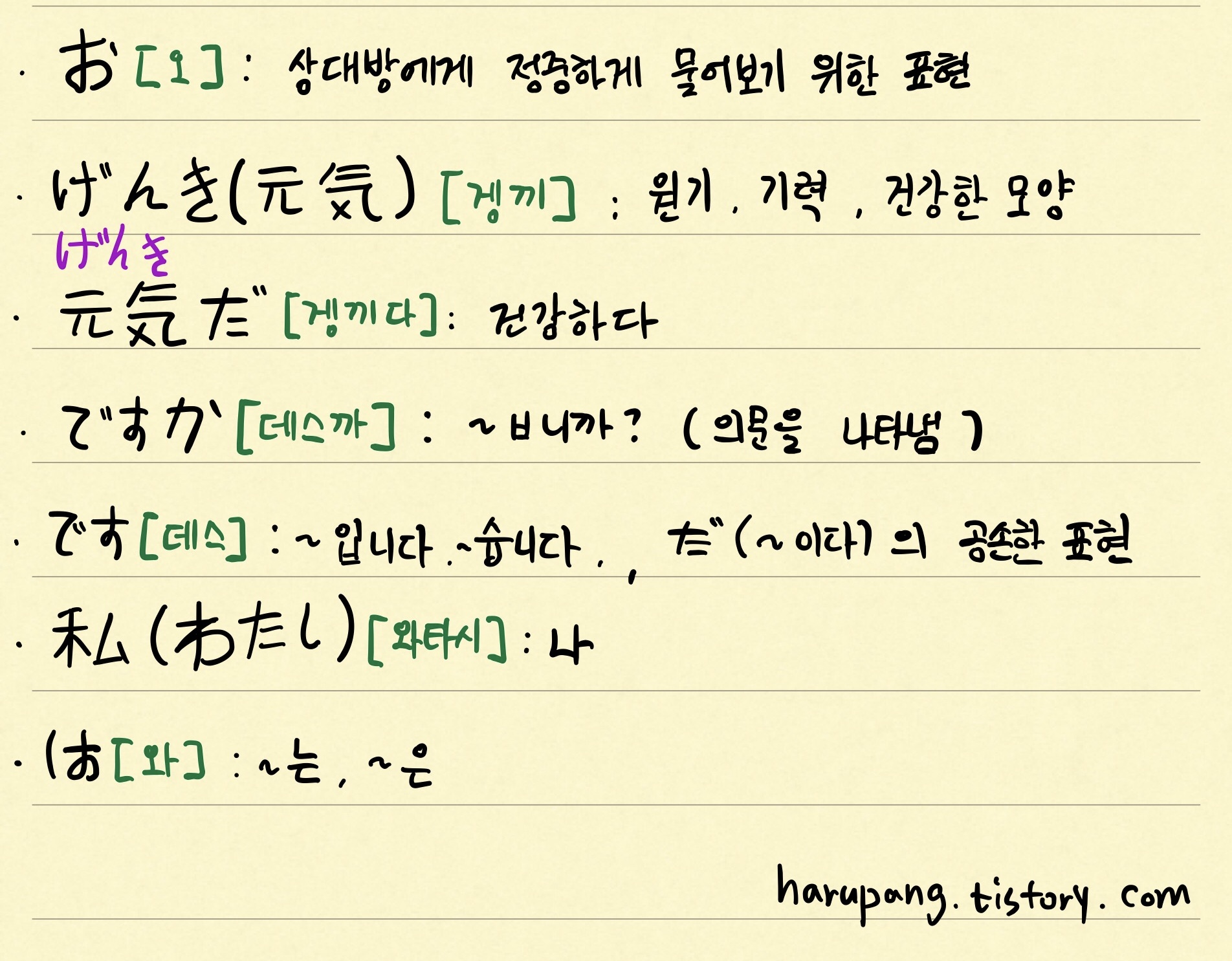 私(わたし) は 元気(げんき) です。 와타시와 겡끼 데스.