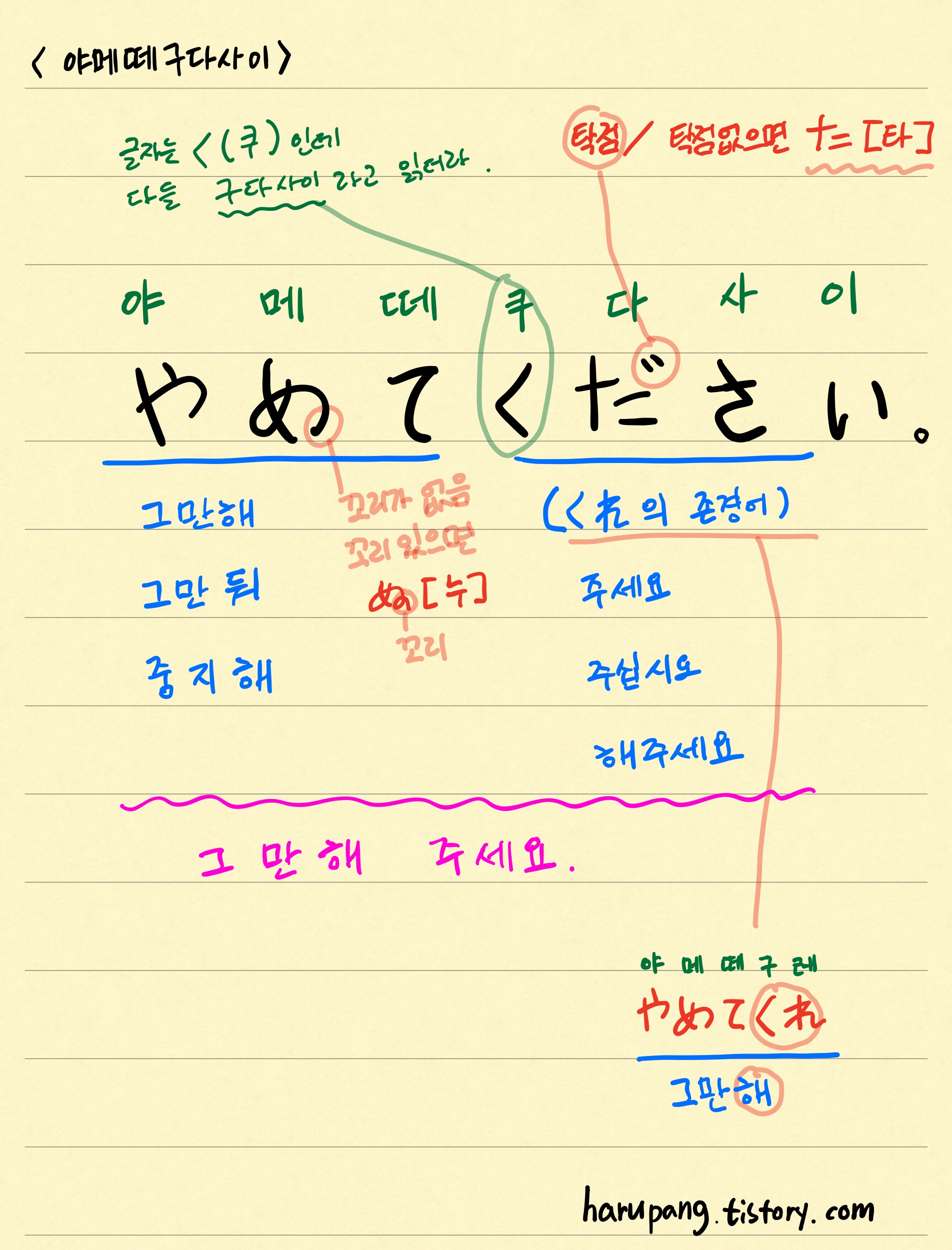 やめて(야메떼)는‘그만해’ , ください(구다사이)는 ‘해주세요’이고 즉 , やめてください(야메떼구다사이)‘그만해 주세요’ 이다 .