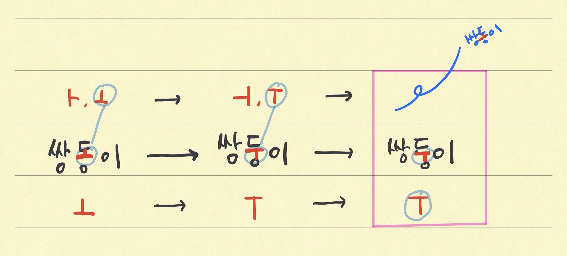 '쌍둥이'처럼 어원에서 멀어져 'ㅏ,ㅗ' 같은 양성모음이 'ㅓ,ㅜ' 같은 음성 모음으로 바뀌어 굳어진 경우 음성 모음 'ㅓ,ㅜ' 를 표준어로 삼는다.