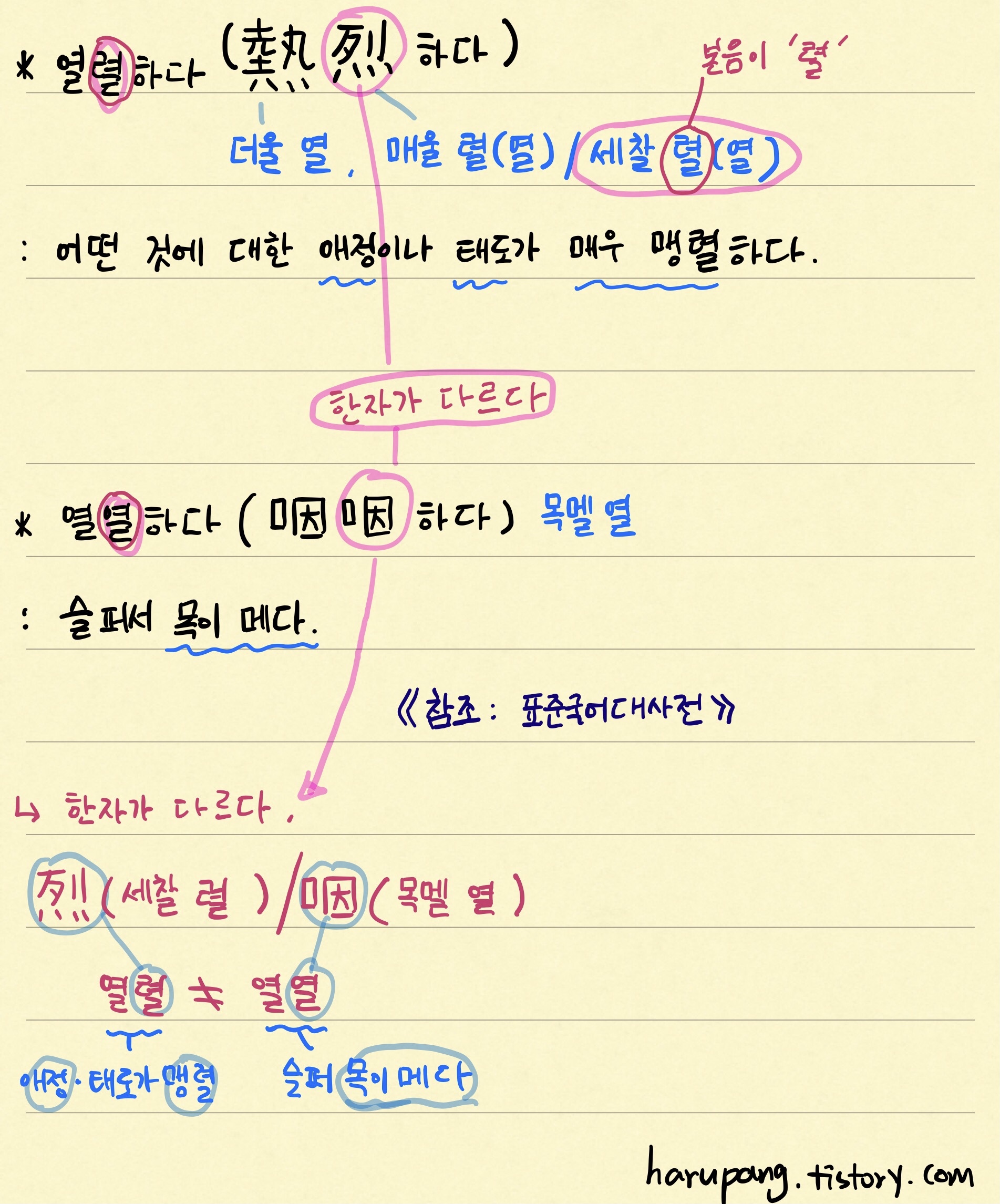 ▶첫 번째 글자는 발음이 '열'로 같지만 , 두 번째 글자는 한자의 본음 자체가 각각 '렬'과 '열'로 다릅니다.