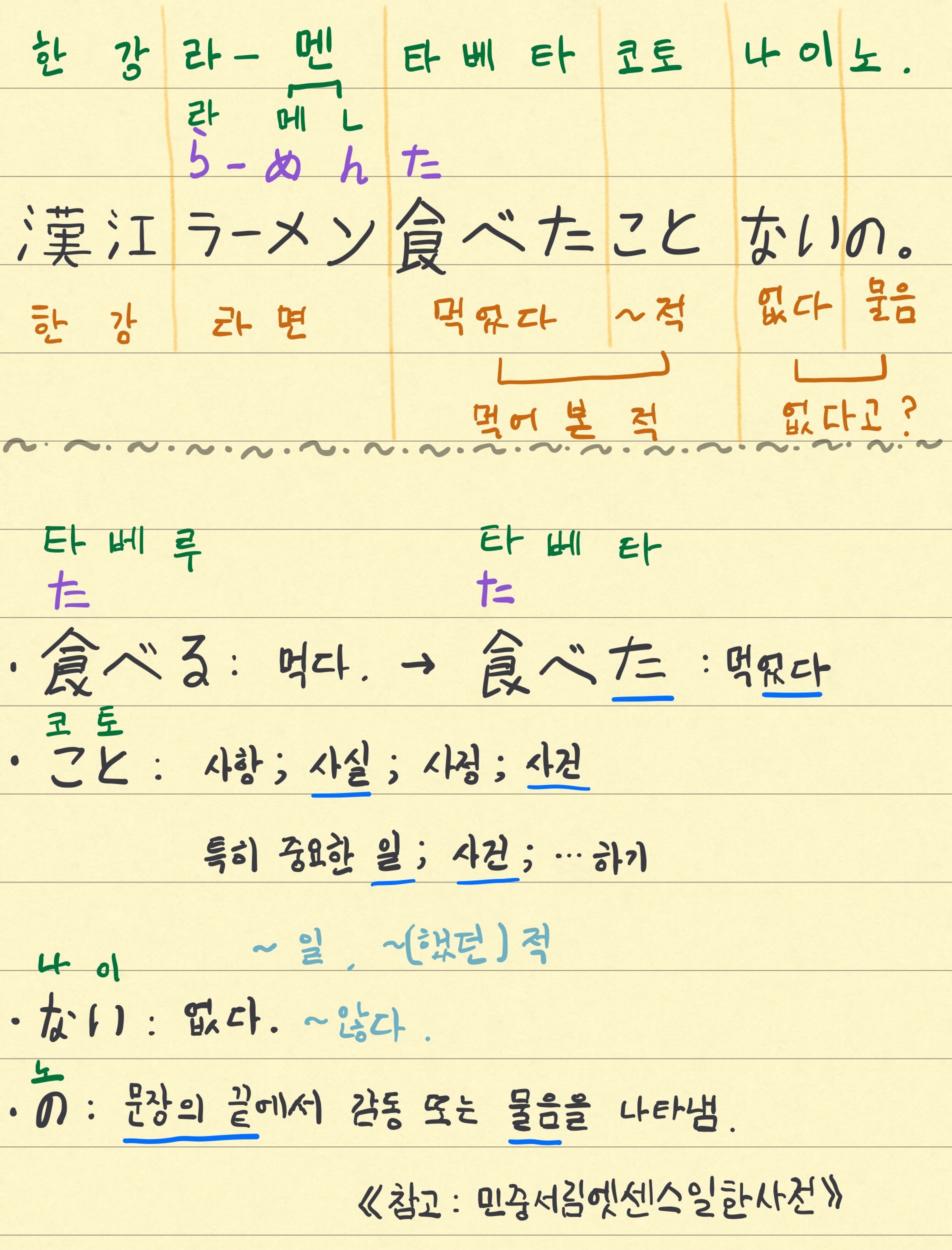 한강에 가면 한강 라면을 먹어야 한다고 합니다. 겁나게 맛있다네요. 사실 저도 안 먹어 봤습니다. 일본어로 '한강 라면 먹어 본 적이 없다고? '라는 망을 들었는데요. '한강 라멘 타베타 고토 나이노.' 이렇게 말하더군요. 분석해 보겠습니다.